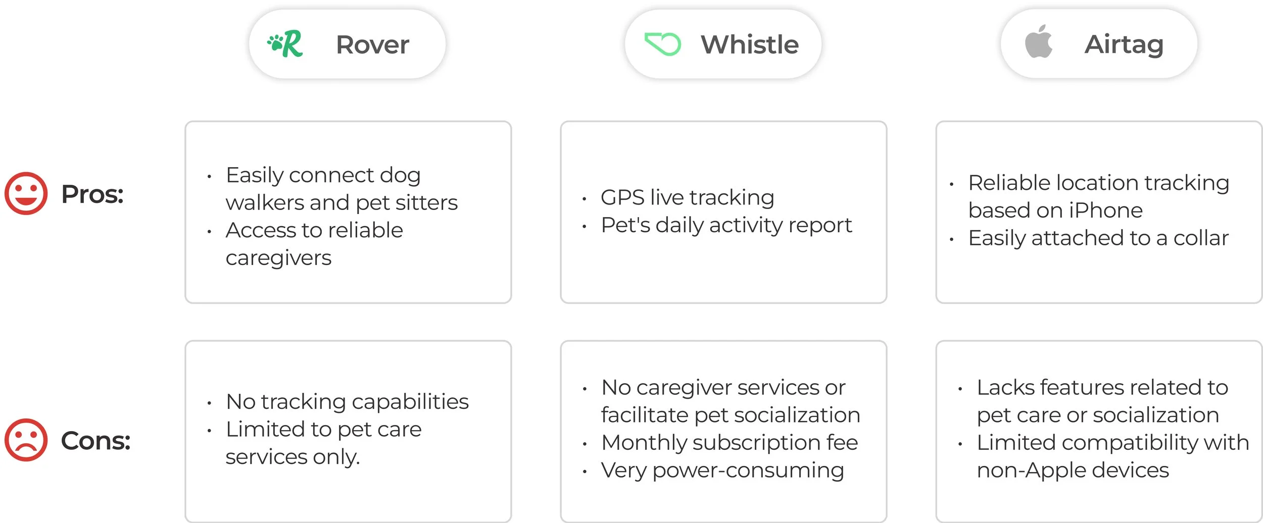 By examining the strengths and weaknesses of AirTag, Rover.com, and Whistle Pet Tracker, we gained valuable insights into the competitive landscape.