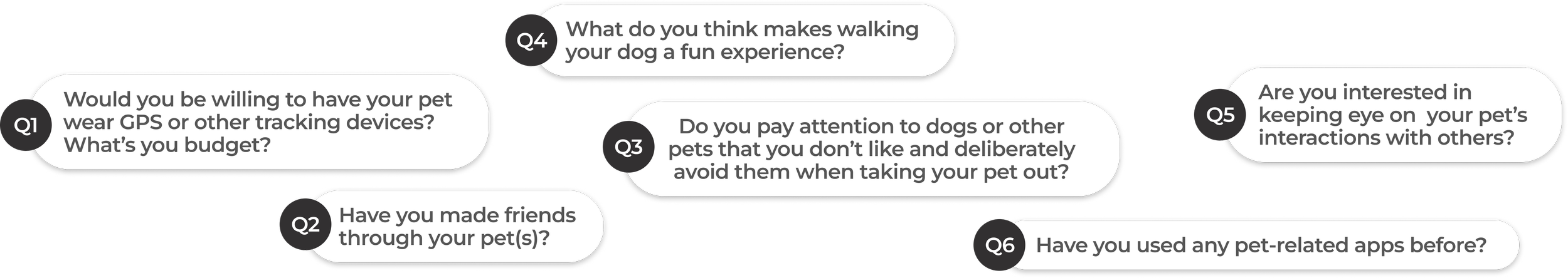 As we wanted to gather insights and feedback directly from pet lovers, we did online & street surveys as well as interviews. There are three questions asking their thoughts about the pet location tracker, their dog walking habits, and how their pets and themselves make friends.